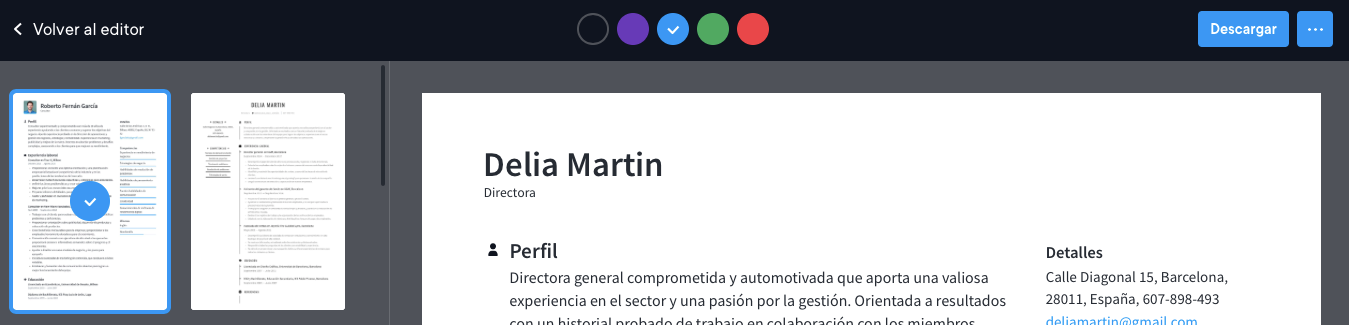 Usar nuestra herramienta de color personalizado para darle un toque brillante a tu currículum y cambiar el color del tema
