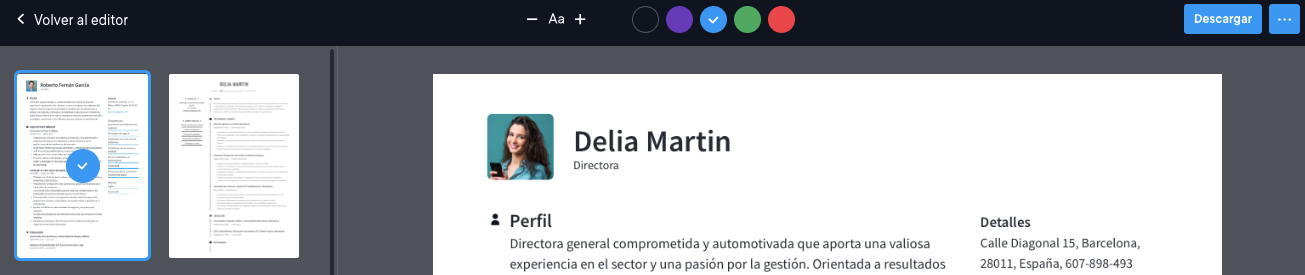 Cambiar el color / tema del diseño: más información sobre cómo cambiar de plantilla y personalizar los colores aquí. Usa nuestra sencilla herramienta de elección de color para darle un toque brillante a tu currículum.