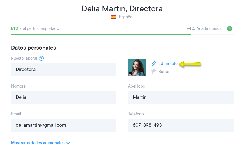 En la sección de los datos personales, encontrarás la opción para cargar una foto. Echa un vistazo a la siguiente captura de pantalla.