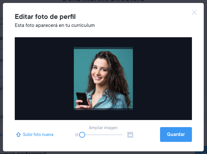 La imagen ideal para usar como foto de tu currículum es una imagen cuadrada con una relación de 1:1 y de al menos 600 x 600 píxeles. También dispones de varias opciones para ajustar la foto una vez cargada. Echa un vistazo a la siguiente captura de pantalla.