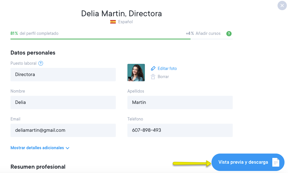 A medida que vayas añadiendo contenido a tu currículum, podrás previsualizar tu documento en la plantilla siempre que quieras en la página de vista previa. Tus modificaciones quedarán reflejadas en tiempo real en la vista previa.