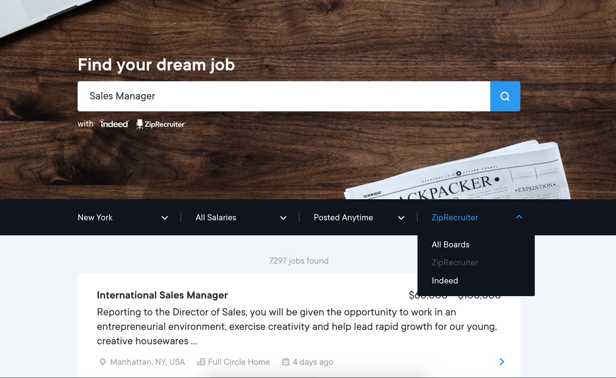 En lugar de buscar oportunidades de empleo en diferentes bolsas de trabajo en línea, ahora puedes ahorrar tiempo buscando en Indeed y ZipRecruiter desde un solo lugar dentro de cvapp.es.