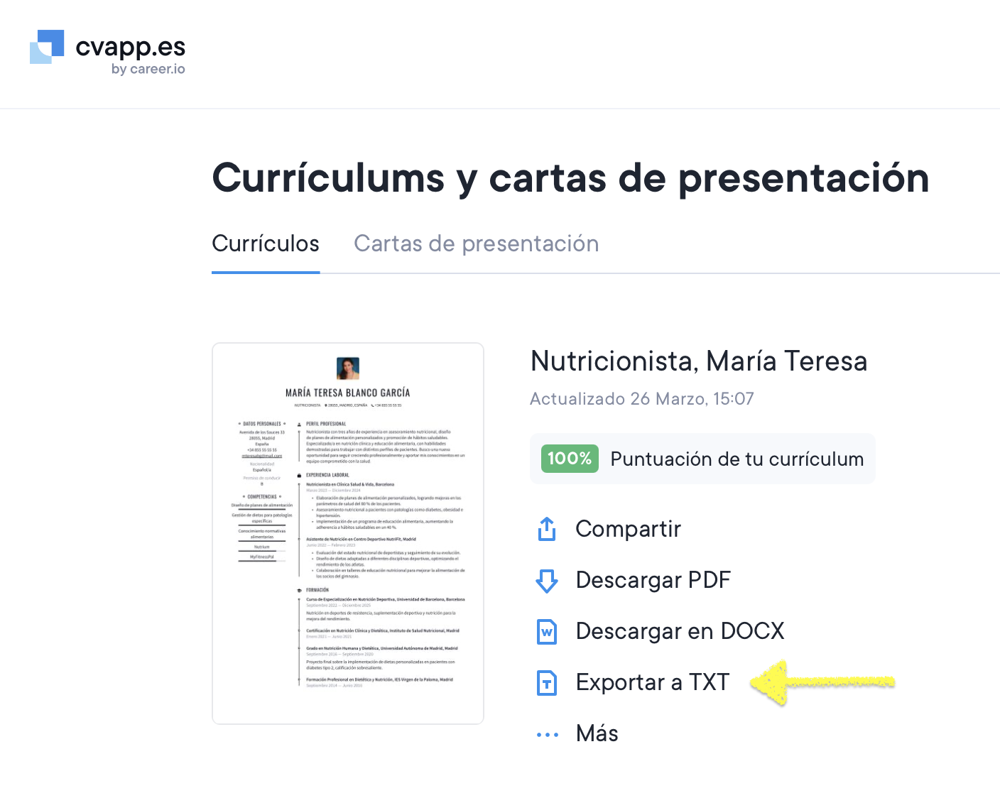 Con el plan gratuito de cvapp.es, puedes descargar tu currículum como archivo PDF (usando la plantilla Vancouver) o como archivo TXT.